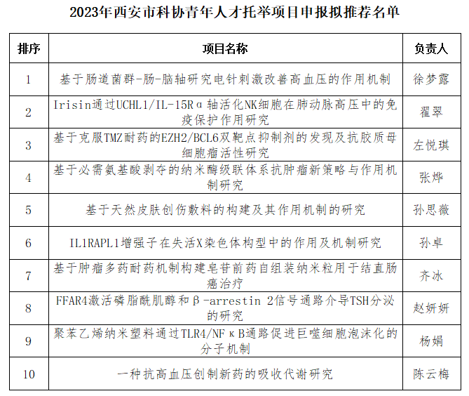 我校组织了2023年西安市科协青年人才托举项目申报评审工作。评审结果提交校学术委员会通过,现将拟推荐上报项目名称、负责人姓名进行公示。