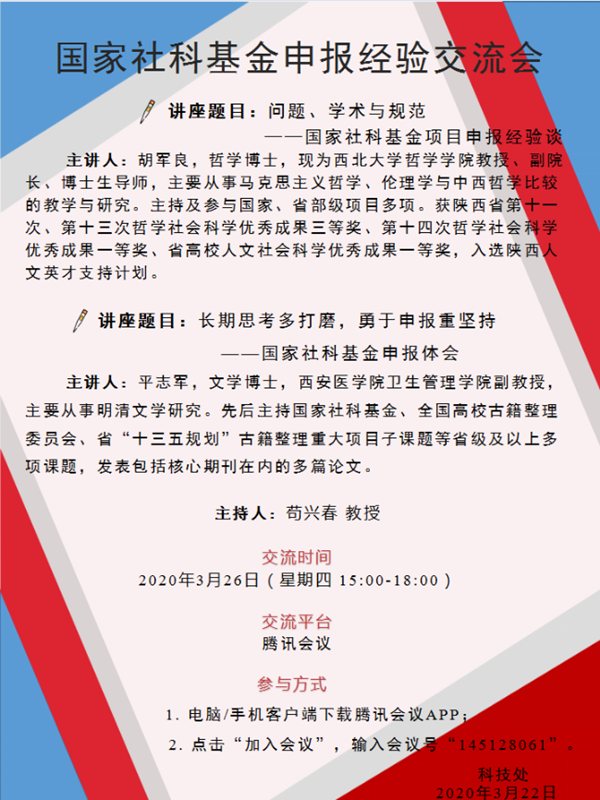 新型冠状病毒肺炎疫情虽然阻碍了师生返校的步伐,却阻挡不了我校教师对科研工作的热情。为推动我校哲学社会科学研究繁荣与发展,促进2020年国家社科基金项目申报和立项走上新台阶,2020年3月26日下午,我校科技处通过“腾讯会议”线上平台举行了2020年国家社会科学基金申报专家辅导会。分别邀请了西北大学哲学学院副院长、博士生导师胡军良教授和我校卫生管理学院副教授平志军博士,辅导会由科技处副处长苟兴春教授主持,近百名教师参加了会议。