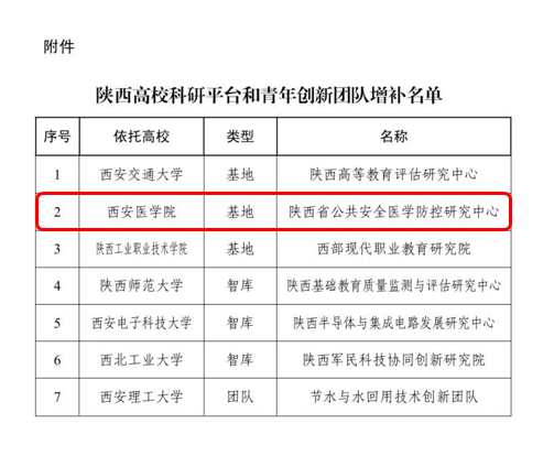 近日,陕西省教育厅公布了《陕西高校科研平台、青年创新团队增补结果的通知》(陕教〔2020〕64号),我校获批首个陕西(高校)哲学社会科学重点研究基地――陕西省公共安全医学防控研究中心。 本次获批的陕西省公共安全医学防控研究中心由公共卫生学院门可副院长牵头,依托公共卫生学院和西安医学院健康信息与技术研究所筹建。陕西省公共安全医学防控研究中心,是为强化突发公共卫生事件应急管理体系中多学科和领域交叉融合研究能力、服务西部大健康现代化治理体系发展战略需求而建立的,旨在提供公共卫生应急管理政策研究、智库咨询等指导作用的综合研究机构和平台。以突发公共卫生事件现代化应急管理体系为主要研究方向,利用大数据分析方法和互联网技术,从临床医学、预防医学、社会学、教育学、管理学等多学科角度,围绕公共卫生应急风险识别和评估体系、公共卫生应急管理信息平台和联动机制、公共卫生应急管理策略与路径三个方向,探讨公共卫生法治保障、疾病预防控制体系、重大疫情防控救治体系、重大疾病医疗保险和救助制度、应急物资保障体系等系列问题,为提高西部公共卫生应急管理水平、增进居民健康素养、实现小康社会目标提供良好科研平台。计划到2023年,建成高水平公共卫生应急管理智库服务平台,形成一批有效支撑公共卫生应急管理高质量发展的政策、制度;到2035年,实现公共卫生应急管理研究水平与国内外先进水平对接,在国内进入先进行列。在此向门可副院长及公共卫生学院表示祝贺,希望各教学科研单位以模范先进为榜样,在我校科研平台建设工作上,比学赶超、攻坚克难、再创佳绩。