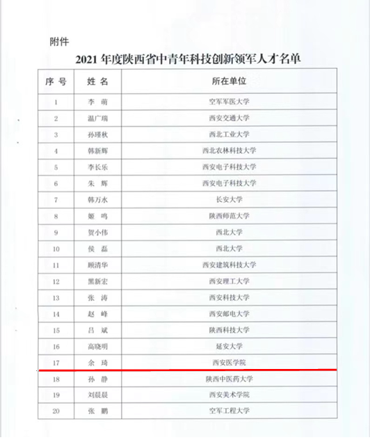 近日,陕西省科技厅印发了《关于公布2021年陕西省创新人才推进计划入选人员的通知》(陕科政发[2021]106号),我校基础与转化医学研究所余琦教授入选获得“陕西省中青年领军人才”称号。
