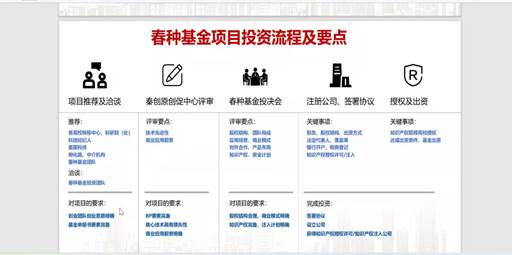 会上,王晖从基金设立背景、申请流程、申请要求,申请对象、投资方向、投资标准及要求等方面对春种基金进行了详细介绍,同时表示,秦创原春种基金作为种子基金,始终坚持“扶持转化”的原则,以股权投资形式参与省内高校科技成果转化项目,从根本上解决项目缺乏初始资金投入等问题,从而有效推动项目从创意阶段向具体产品或服务阶段的转化。