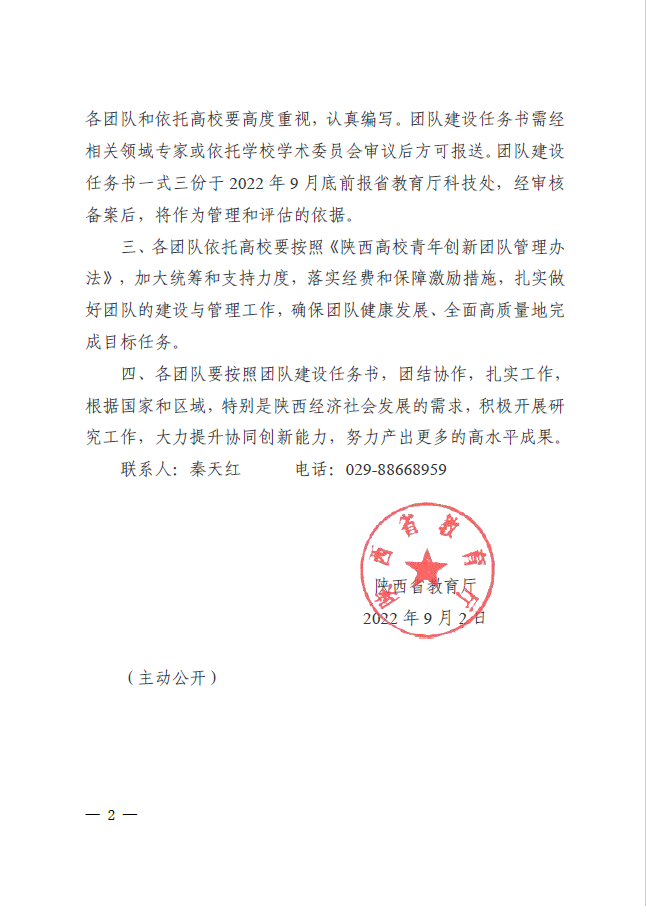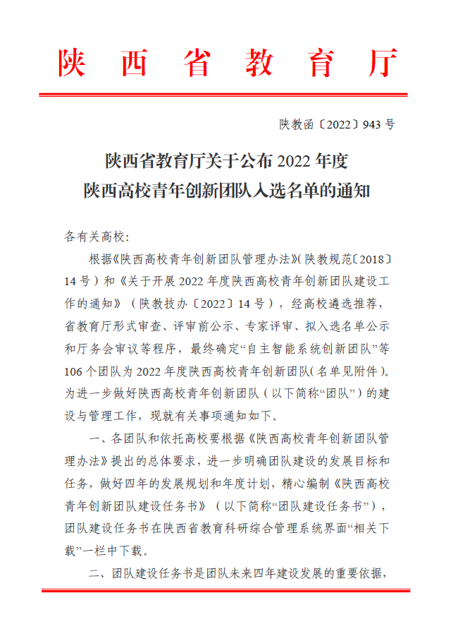 日前,陕西省教育厅发布《关于公布2022年度陕西高校青年创新团队人选名单的通知》(陕教函[2022] 943号),我校3个青年团队在2022年陕西高校青年创新团队推荐工作中喜获批准。这是继2020年之后,我校再次获批该类创新团队,目前累计获批高校青年创新团队7个。