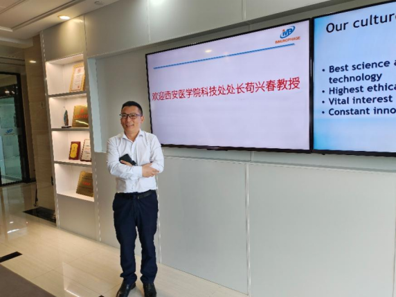 为提高人才培养质量,推进校企合作,西安医学院科技处处长/基转所所长苟兴春教授一行五人,赴上海艾美斐生物医药科技有限公司交流学习,受到董事长范国煌、首席科学官王建飞等热情接待。
