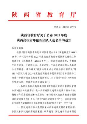 近日,陕西省教育厅发布《陕西省教育厅关于公布2023年度陕西高校青年创新团队入选名单的通知》(陕教函〔2023〕997号),公布了2023年度陕西高校青年创新团队入选名单。我校基础与转化医学研究所李科申报的“医用功能化生物大分子材料研究与转化创新团队”、第一附属医院王胜昱申报的“急性肺损伤防治基础与转化创新团队”、临床医学院拉吉姆申报的“尼泊尔传统药抗肿瘤基础转化研究创新团队”3个青年创新团队获批入选。自2019年以来,我校共获批入选陕西高校青年科技创新团队10个。