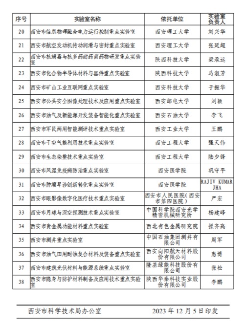 西安市科学技术局近日发布了《西安市科学技术局关于认定2023 年度市级重点实验室的通知》(市科发〔2023〕119 号),经学校科技处组织遴选、预答辩、推荐,西安市科技局组织专家评审、现场考察、网上公示等程序,我校巩守平教授牵头申报的西安市风湿免疫病防治重点实验室、RAJIV KUMARJHA教授牵头申报的西安市肿瘤早诊创新转化重点实验室同时获批建设。