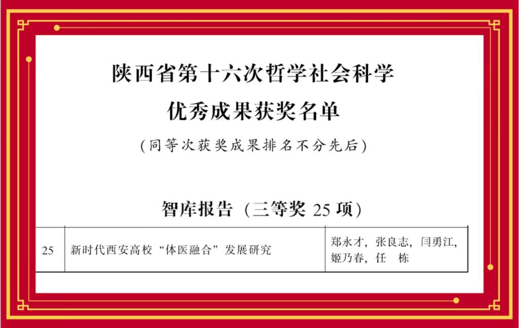 近日,陕西省人民政府发布了《陕西省第十六次哲学社会科学优秀成果获奖名单》,我校体育部郑永才老师团队的成果《新时代西安高校“体医融合”发展研究》获智库报告类三等奖,向郑永才老师及其团队表示热烈祝贺!