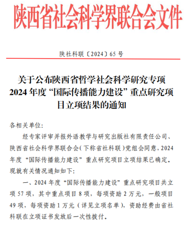 经专家评审并报外语教学与研究出版社有限责任公司、 陕西省社会科学界联合会党组会同意,2024年度“国际传播能力建设”重点研究项目立项结果已确定。2024年度“国际传播能力建设”重点研究项目共立项57项,其中重点项目8项,每项资助2万元,一般项目49项,每项资助1万元。我校外国语学院薛英利老师、郭子凯老师团队获批一般项目立项资助,资助经费各1万元。
