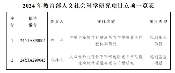 日前,教育部社科司官网发布了《关于2024年度教育部人文社会科学研究一般项目立项的通知》,我校体育部陈亮、杨建全教授申报的项目获得2024年度教育部人文社会科学研究规划基金批准立项。