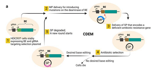 基于CRISPR/Cas碱基编辑器连续定向进化系统(CDEM)的原理示意图