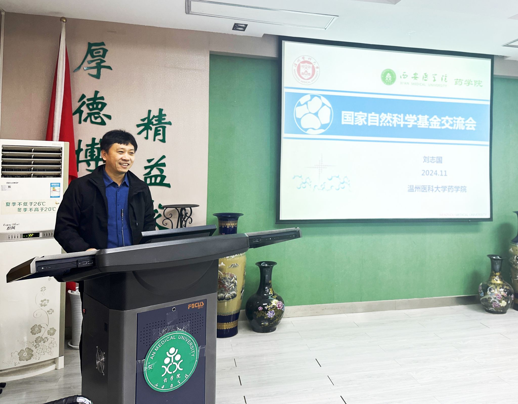 为全力推进2025年国家自然科学基金项目申报工作,加强科研人员之间的交流合作,持续做好有组织科研,提高国家自然科学基金项目申报质量,11月29日上午,科技处和药学院共同举办了2025年国家自然科学基金申报经验交流会,温州医科大学药学院副院长、博士生导师刘志国应邀参加并进行了经验分享。科技处、药学院主要负责人、药学院当天上午无课教师及学校科研骨干教师40余人参与。会议由药学院院长冯永辉主持。