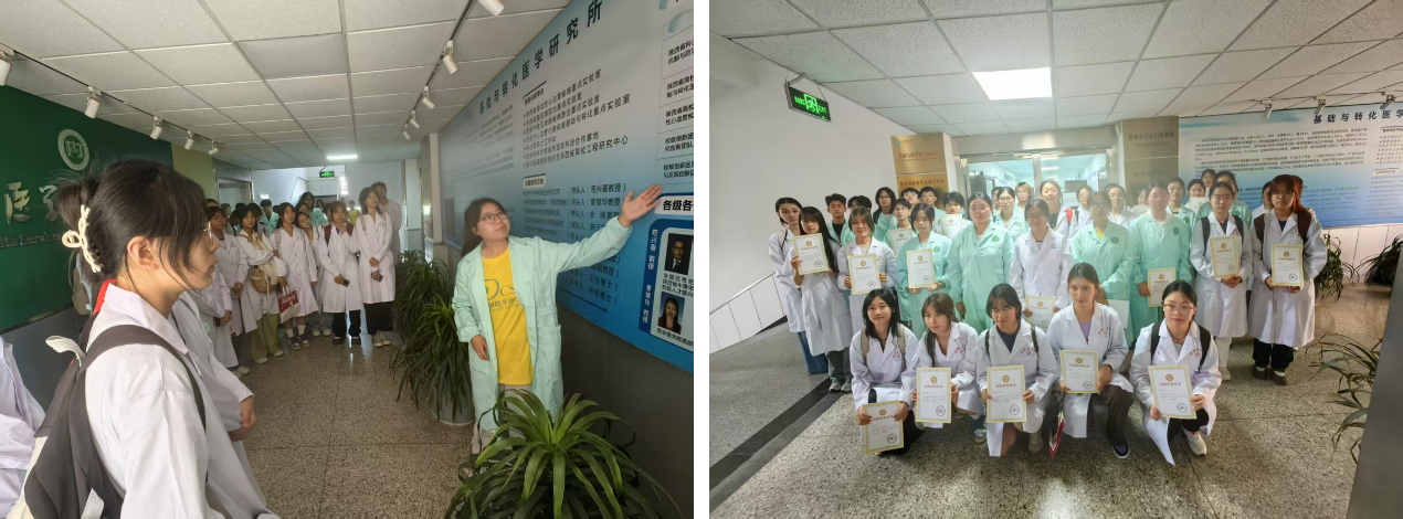 在成果展示区,志愿者通过展板讲解,呈现了实验室团队近年来斩获的各级科研奖项与学术成果。一枚枚奖章背后的科研故事,让同学们深切感受到“台上一分钟,台下十年功”的科研精神。活动尾声,王杉博士为志愿者颁发“中国细胞生物学会实验室开放日”实践活动证书,并合影留念。