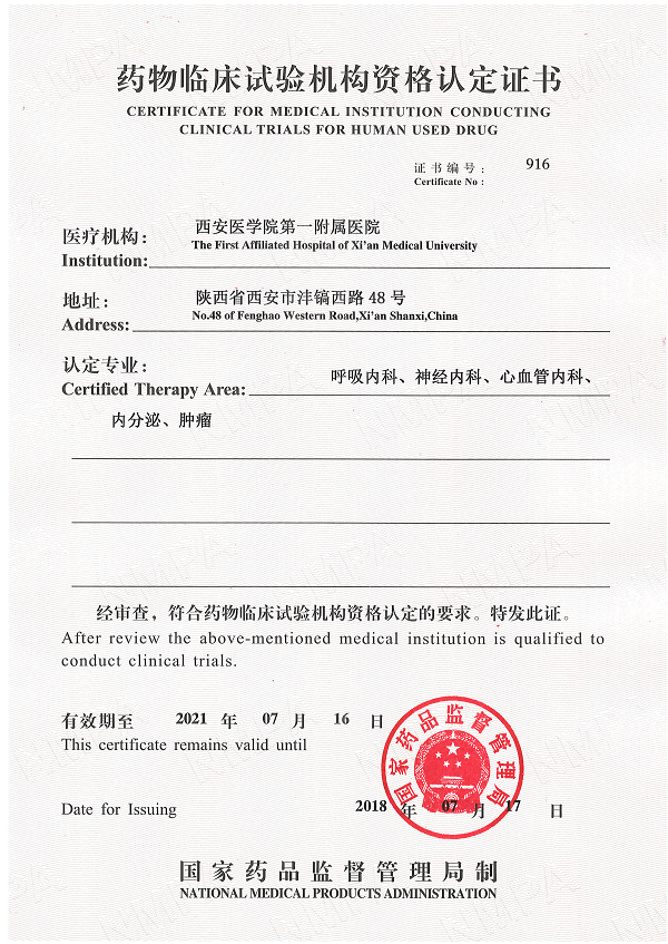 2018年7月17日,国家局发布“药物临床试验机构资格认定检查公告(第1号)(2018年第47号)”,正式认定西安医学院第一附属医院具有药物临床试验机构资格,获得《药物临床试验机构资格认定证书》(证书编号:916)。本院获批药物临床试验资格认证的专业科室有5个,分别为:呼吸内科、神经内科、心血管内科、内分泌科和肿瘤科。