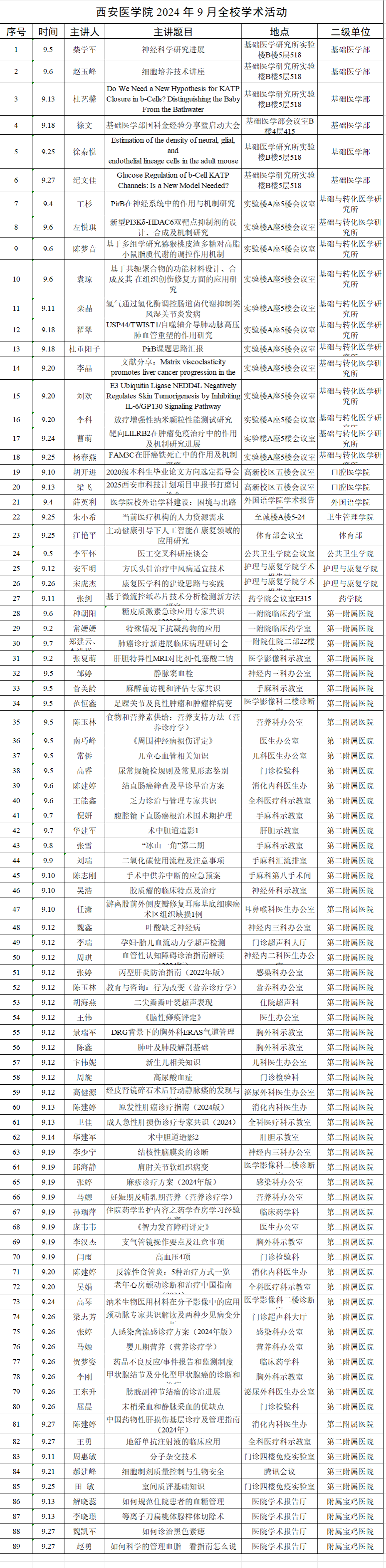 2024年度9月西安医学院学术讲座拟安排