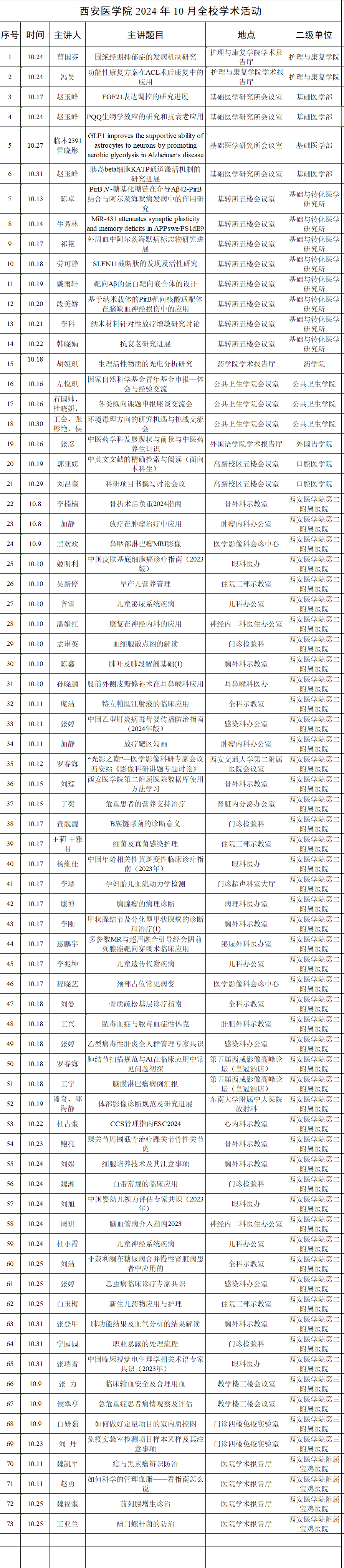 2024年度10月西安医学院学术讲座拟安排